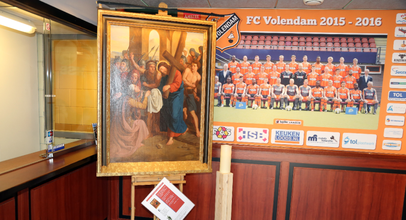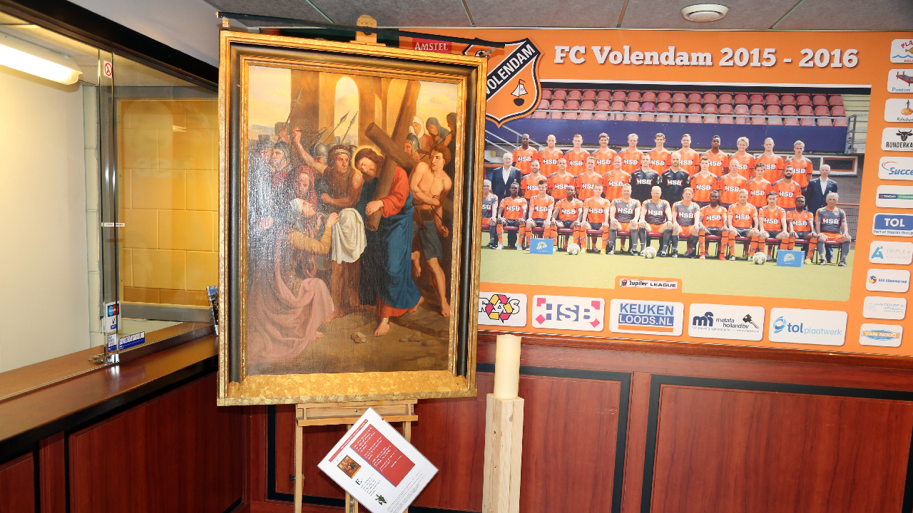 Maandagmiddag waren twee radiodames van KRO-NCRV in het Kras Stadion van FC Volendam. Zij hielden hier een interview met Cees de Wit die over de Kruiswegstatiesroute een en ander vertelde. Ook in het voetbalstadion is een schilderij van de Kruiswegstaties geplaatst.