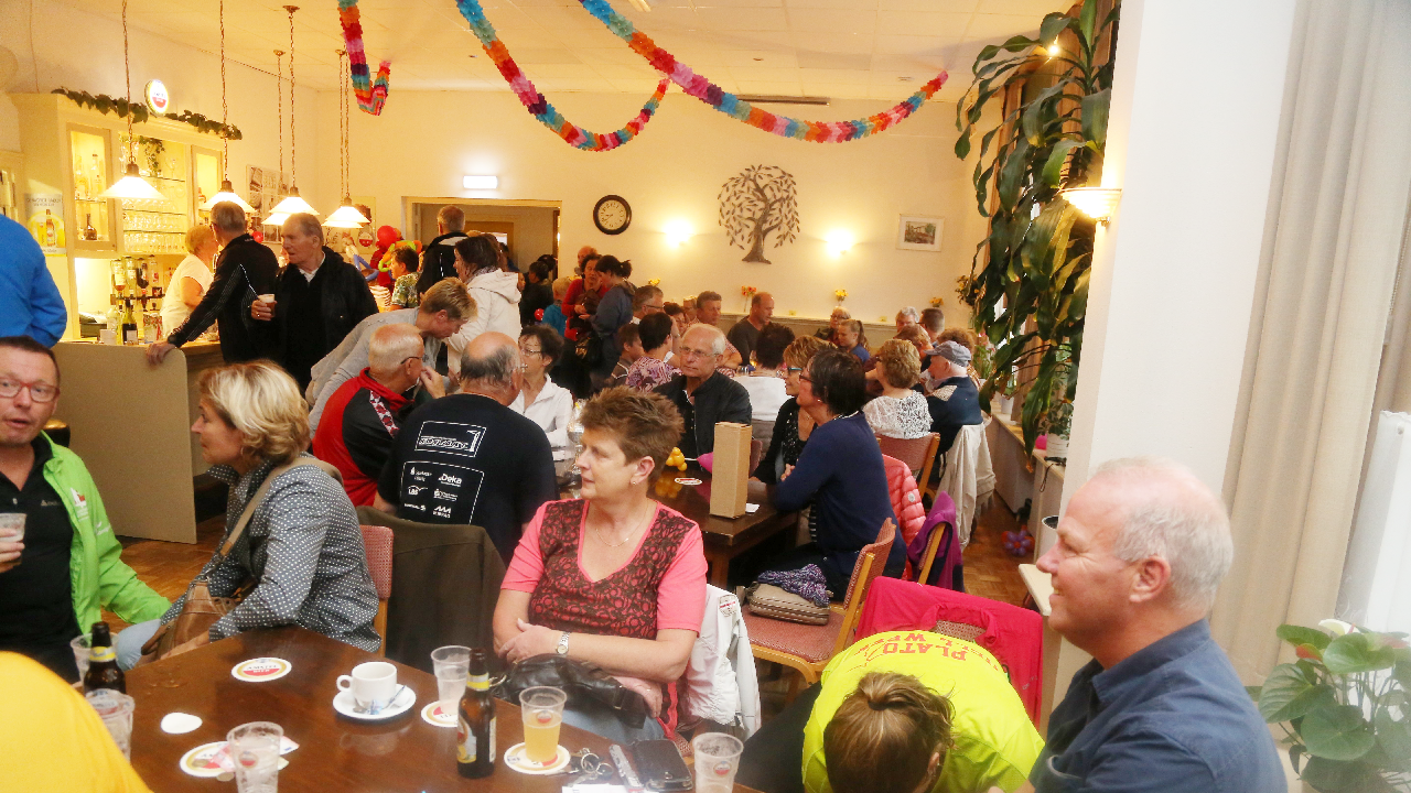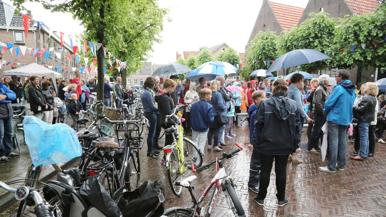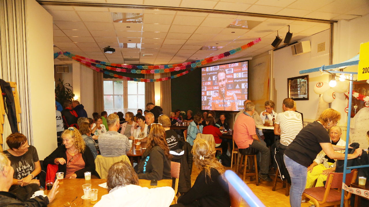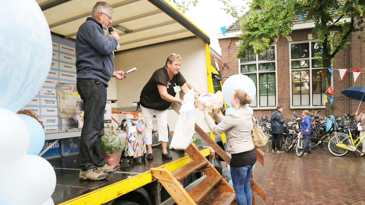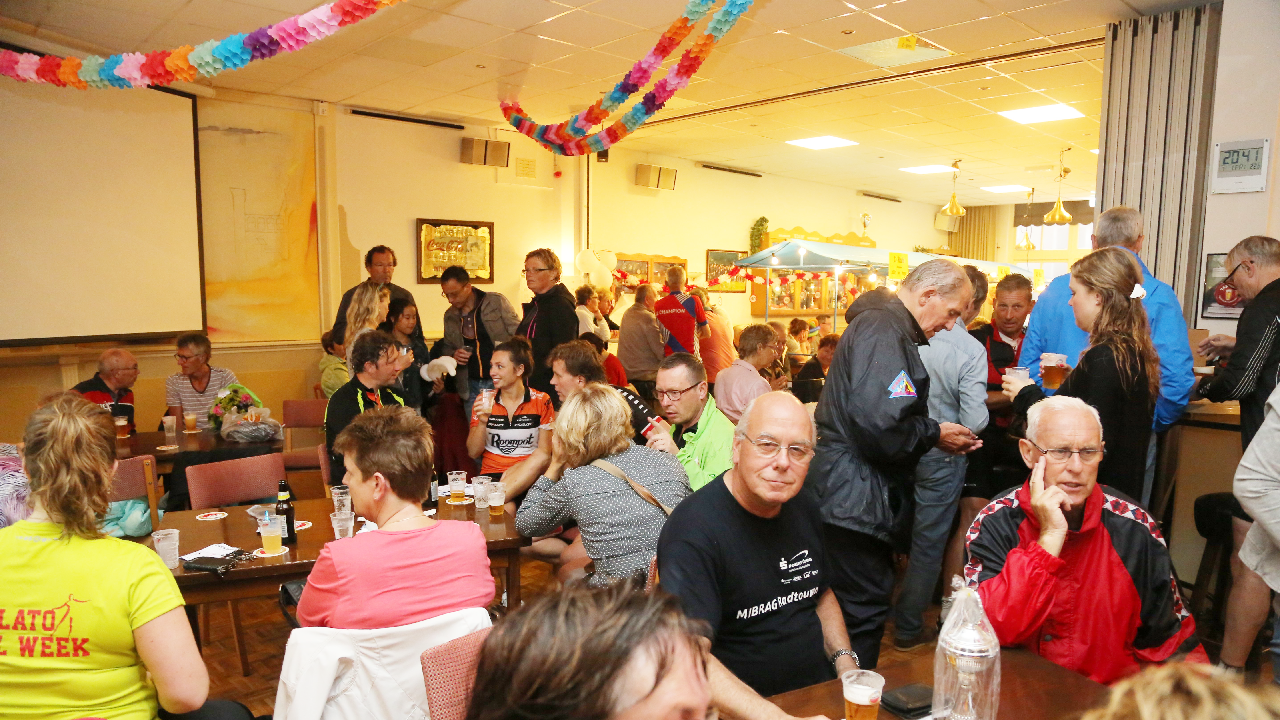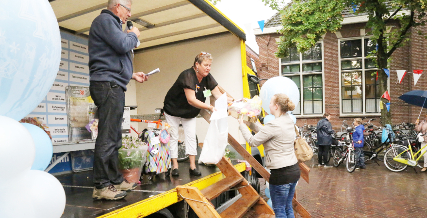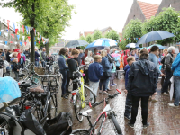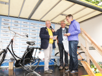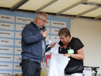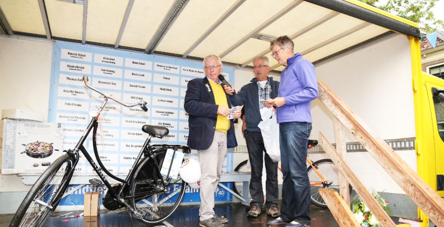 Om 21.00 uur begon de verloting van de extra prijzen en de tien hoofdprijzen van de Fietsvierdaagse. Het regenen werd wat minder, zodat de verloting toch voor het terras van De Burghwall plaatsvond.