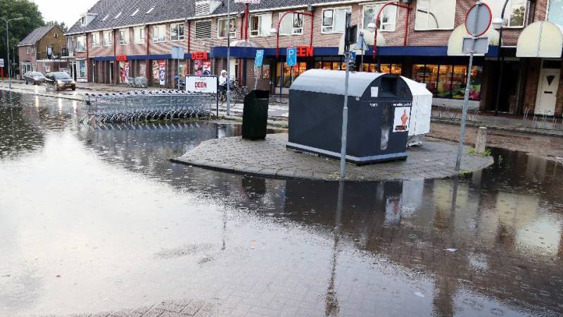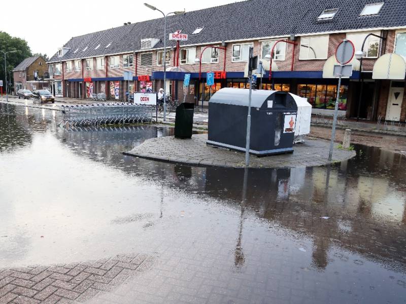 Maandagmorgen om 07.45 uur was er een hevige regenbui. Een kwartier lang stroomde het hemelwater rijkelijk naar beneden. Dat zorgde ervoor dat het parkeerterrein van DEEN Supermarkt in de Burg. van Baarstraat veranderde in een vijver.
