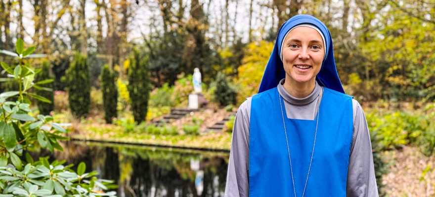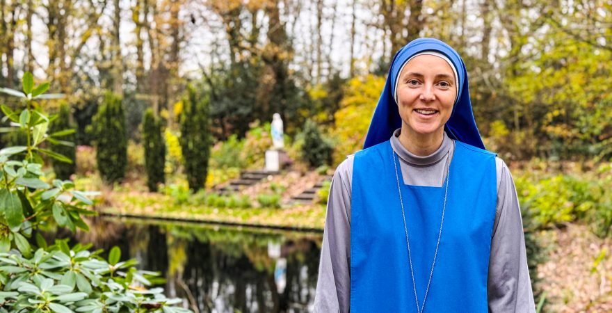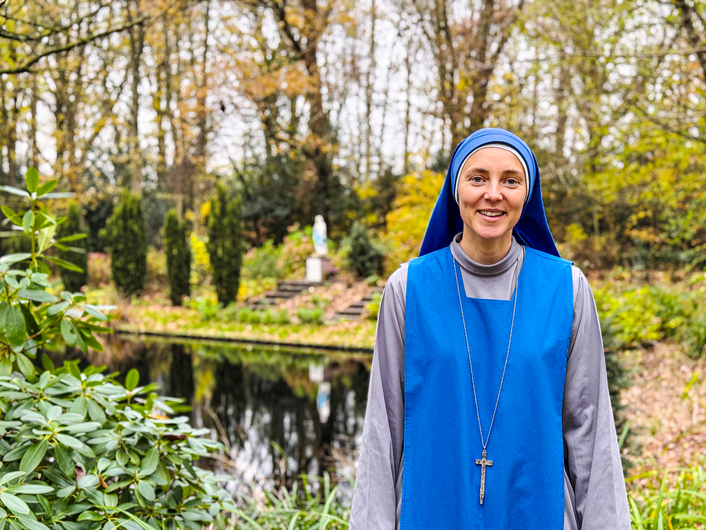 In een kleine spreekkamer binnen het Heiligdom van Heiloo staat een vers gezette cappuccino klaar. Zuster Maria Mater Castissima — geboren als Nellie Zegers (35) — gaat rustig zitten. Achter haar staat een gitaar tegen de muur. ,,Ik heb nog bij Jan ‘To’ op les gezeten vroeger,” zegt ze met een brede lach. ,,Net als de rest van Volendam.” Al bijna zes jaar woont ze op het Heiligdom, waar ze onder meer koster is, jongeren en tieners begeleidt, retraites organiseert en kapeldagen verzorgt voor communicantjes en vormelingen. Daarnaast bereidt ze groepen voor op de toewijding aan Maria en geeft ze catecheselessen. Aan deze tafel vertelt ze openhartig over haar jeugd, haar roeping en de weg die haar langs verschillende landen uiteindelijk naar Heiloo bracht.