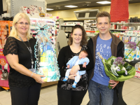 Uit handen van Angelique Schilder, van Parfumeriehuis Gerro & Esther in Winkelcentrum De Stient, kreeg de familie Klouwer een rijkelijk met kadootjes gevulde Pampertaart overhandigd. Vanaf deze plaats nog onze hartelijke gelukwensen.