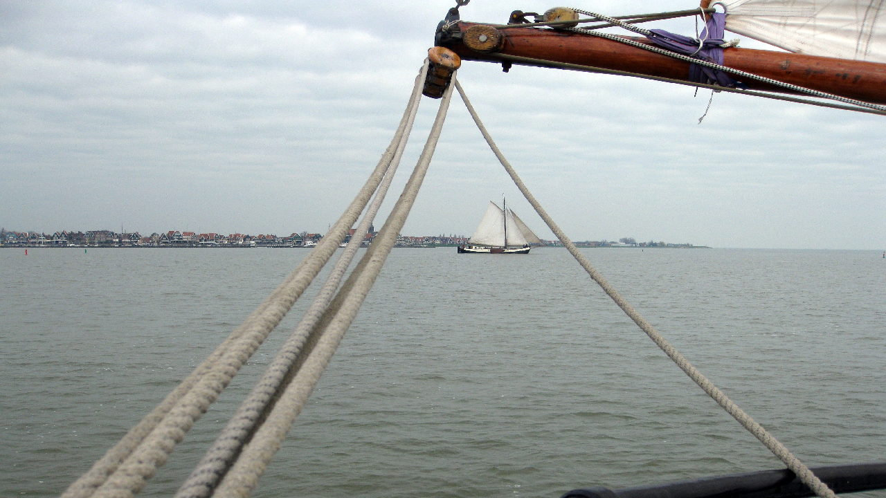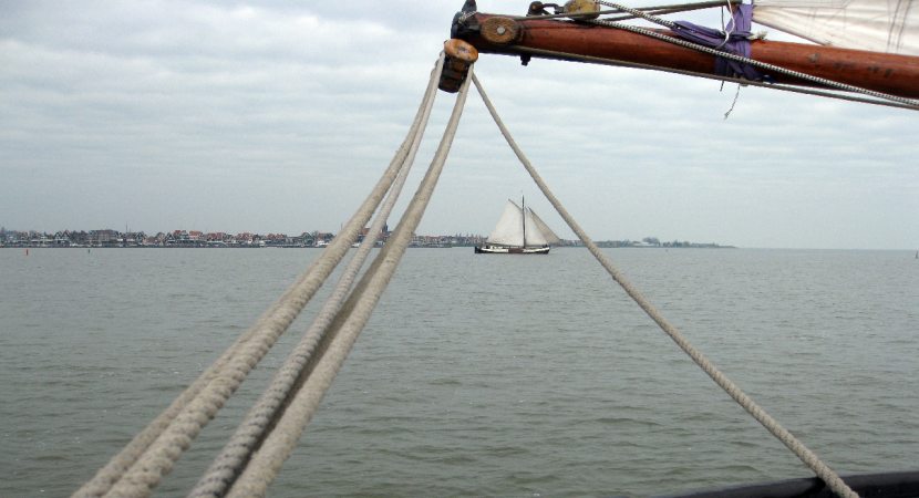 Niet alleen vanaf de havenkade, ook vanaf zee kunnen mooie plaatjes geschoten worden van de Pieperrace en de schepen van de bruine vloot met het silhouet van Volendam als decor.