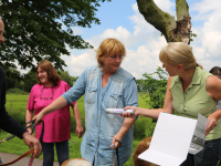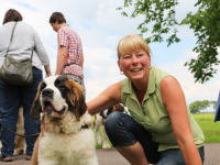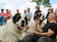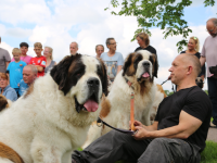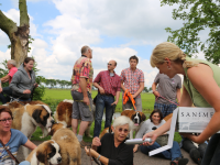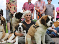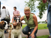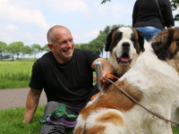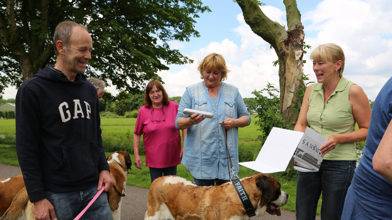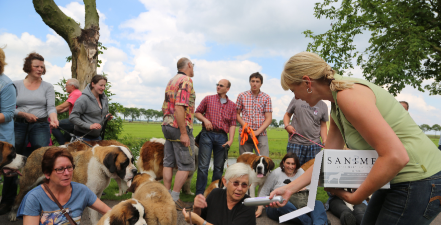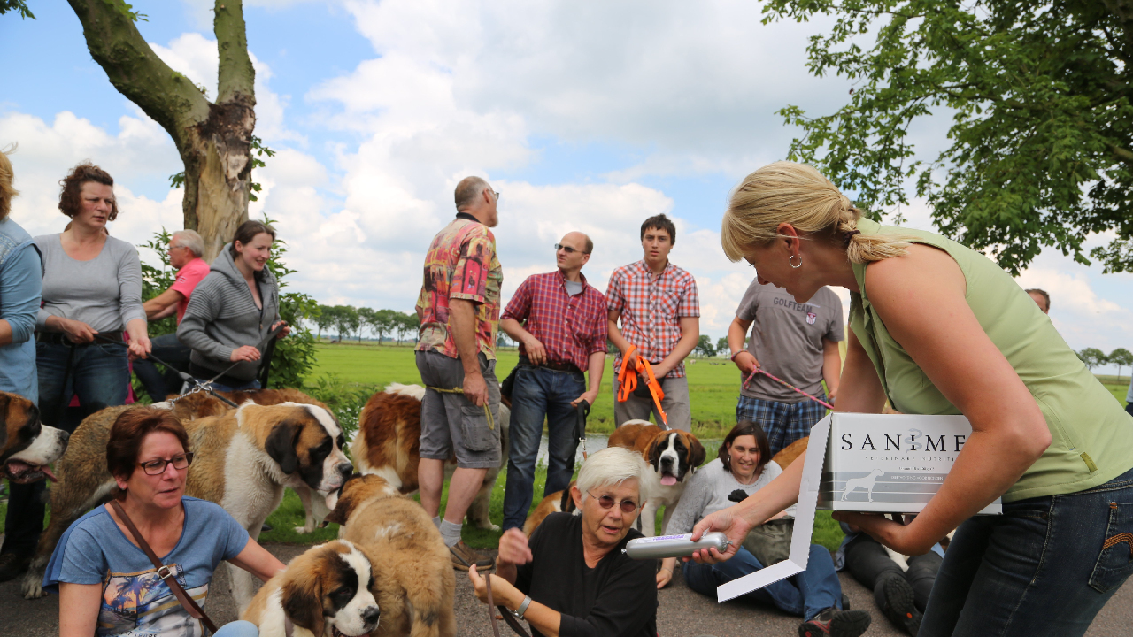 Het was een prachtig gezicht om in deze Sint Bernardhonden te zien. Als presentje werd door Lydia Pool van de Dierenkliniek aan de hondeneigenaren worst met speciaal voer voor de honden aangeboden.