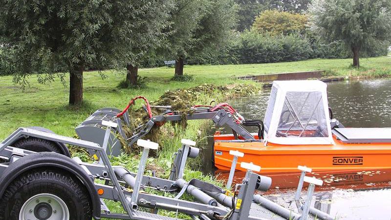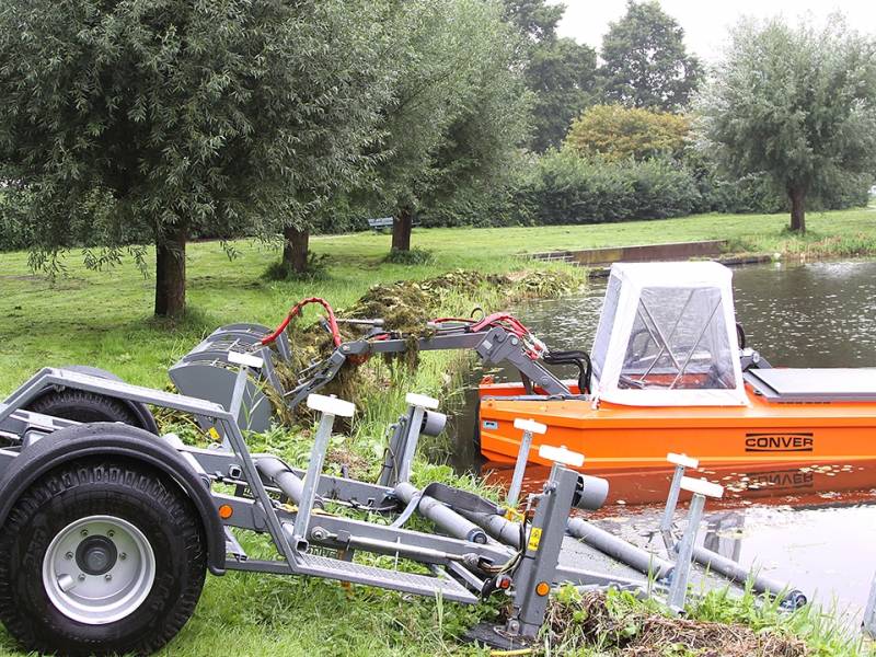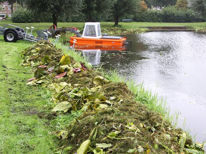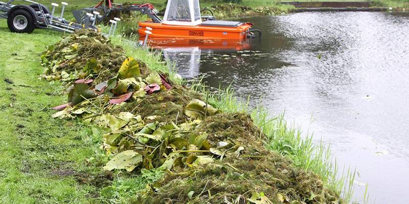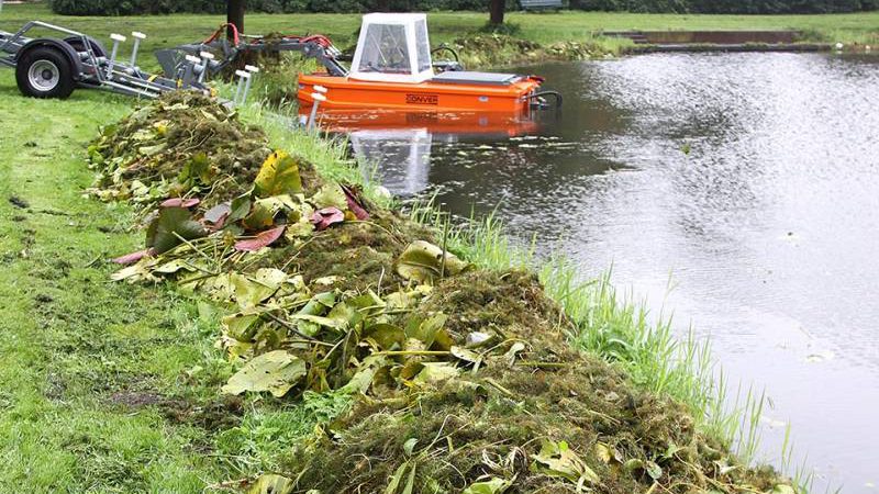 Zo ’n twee maanden zijn twee mannen bezig om alle begroeing en vuil uit alle wateren binnen onze gemeente te verwijderen.