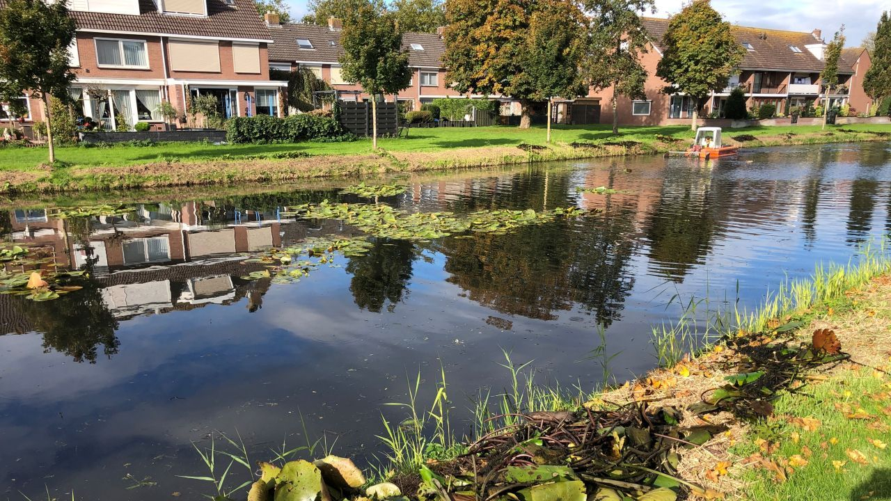 Ook het riet en waterlelies in de sloten worden gesnoeid. Hiervoor wordt een bootje met scheparm ingezet. Langs de oevers van de sloten liggen her en der hopen met gesnoeide en uit het water geschepte waterplanten.