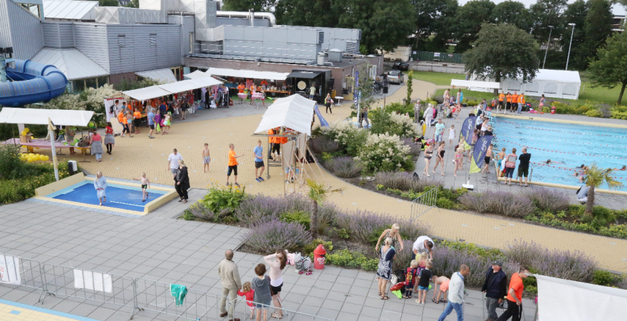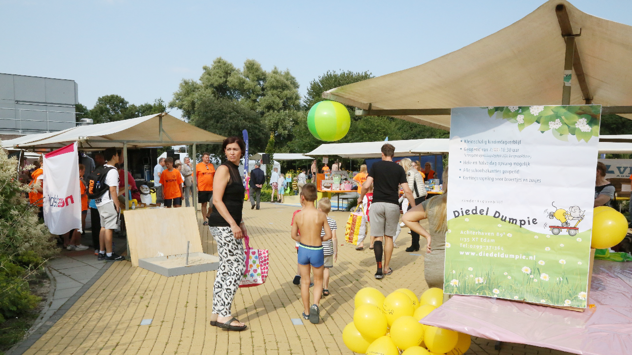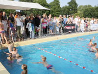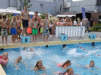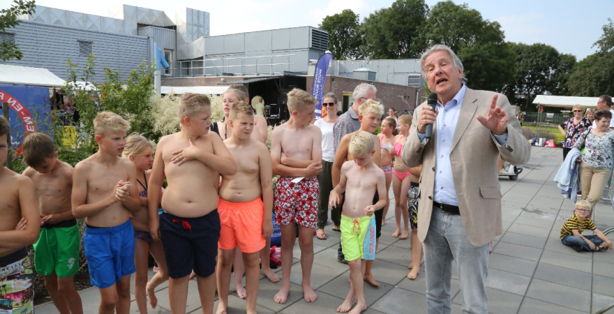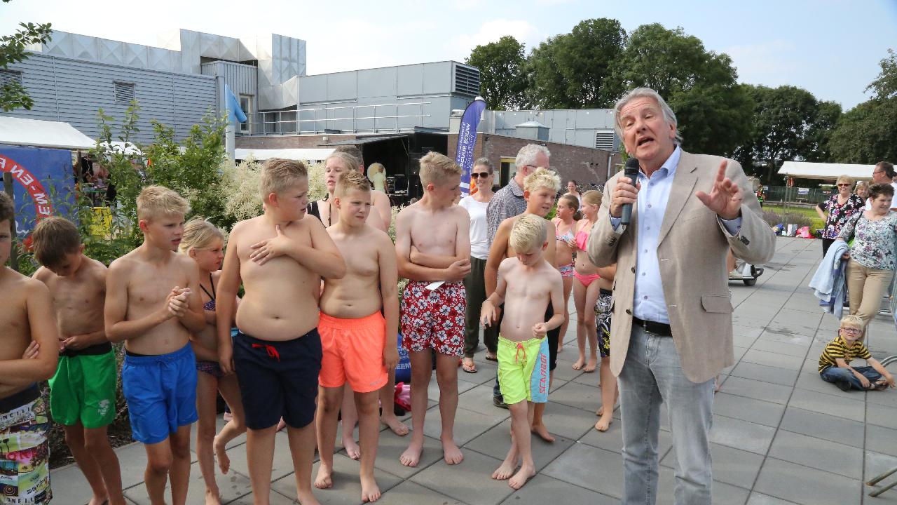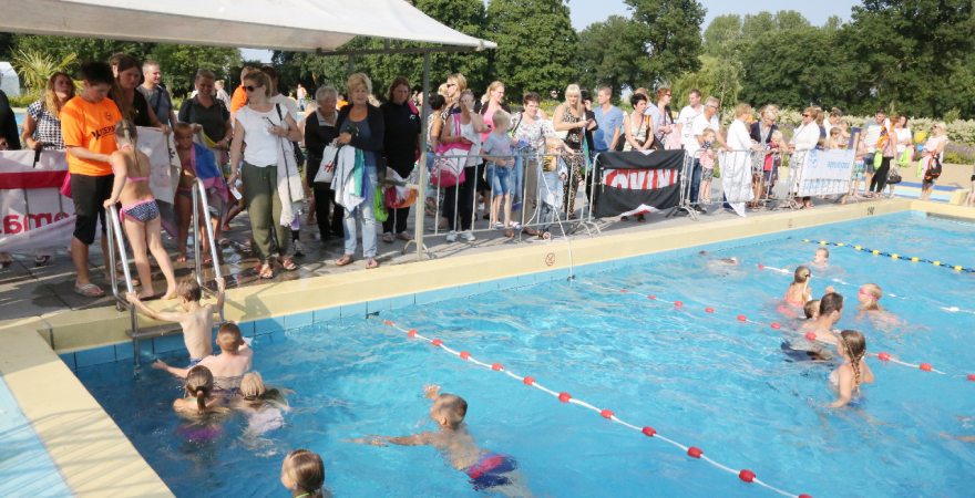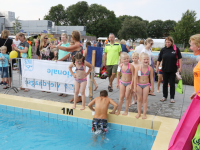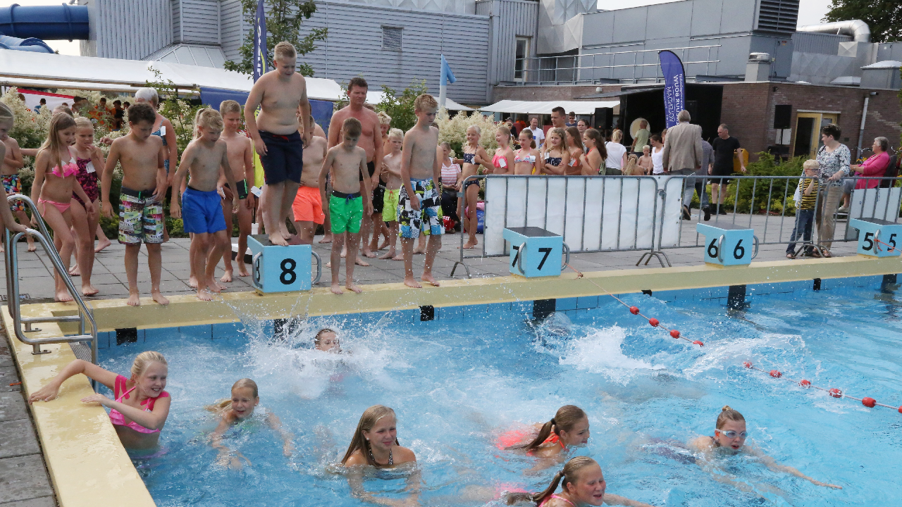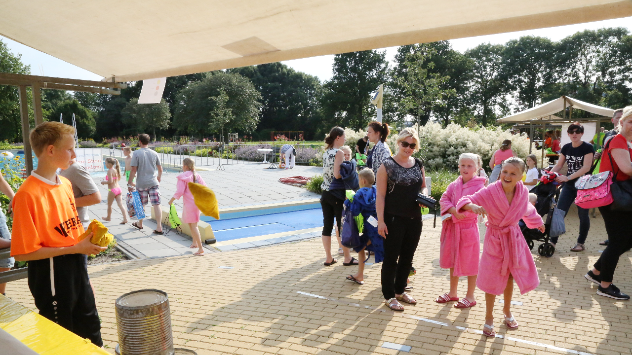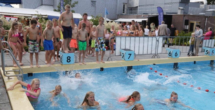 Het startsein werd gegeven door wethouder Hans Schütt. Na “3-2-1” ging de eerste zwemster van start voor de tien baantjes van 50 meter. Op het terrein van De Waterdam staan weer veel kramen met spellet-jes, de verkoop van bolle buisjes en een loterij met veel prijzen.