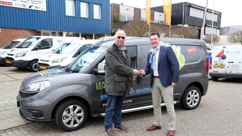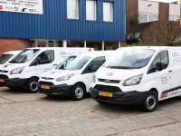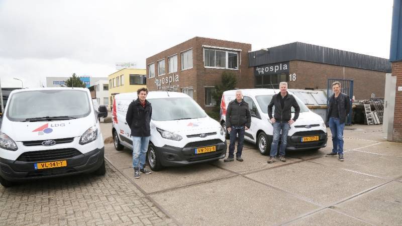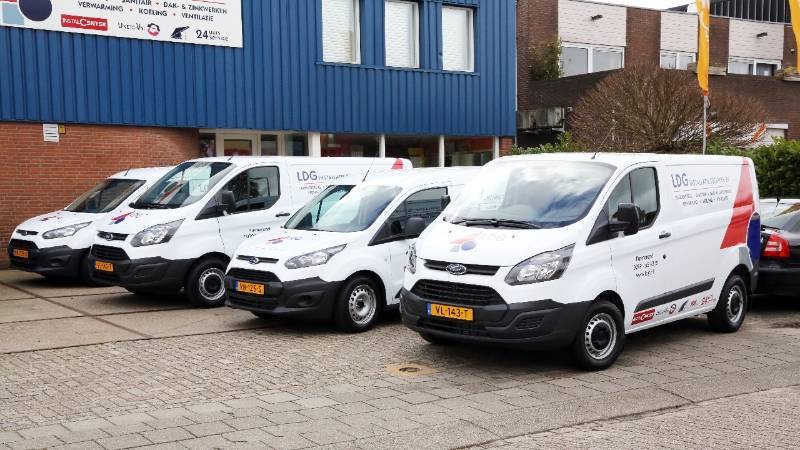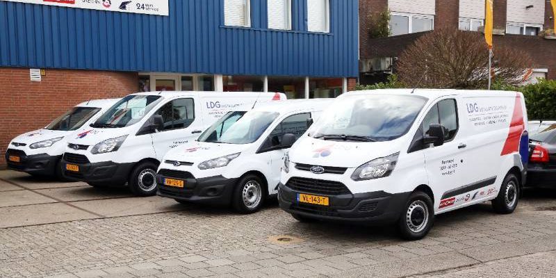 Voor het bedrijfspand aan de Nijverheidsweg 16 te Purmerend werden de Ford’s gestald om er een foto van te kunnen maken. Ook werd een Fiat Doblo Cargo afgeleverd die rijdt op aardgas, zodat LDG nu ook milieuvriendelijk de buitendienst verzorgt.