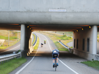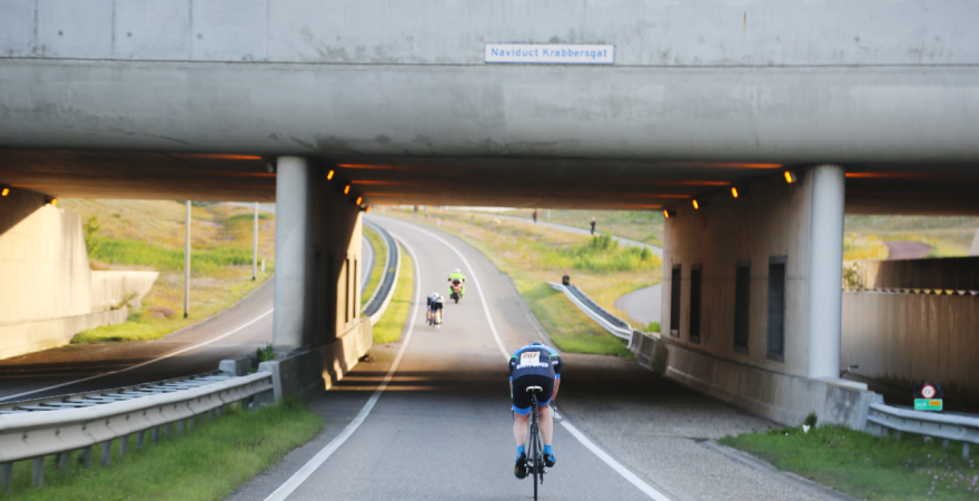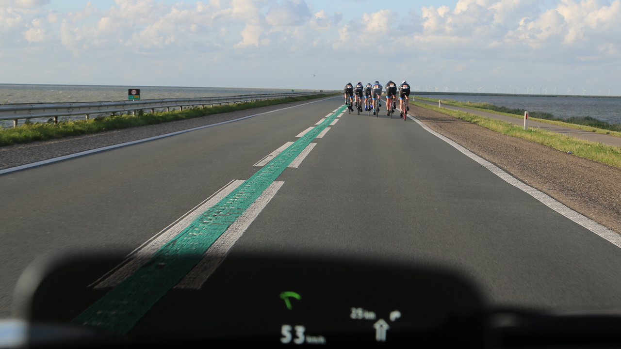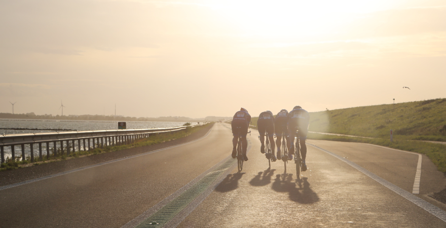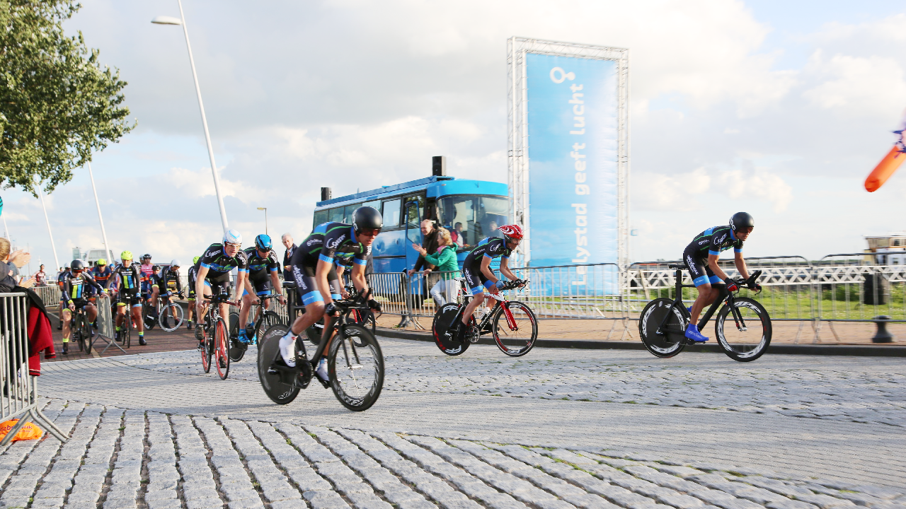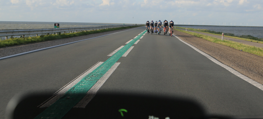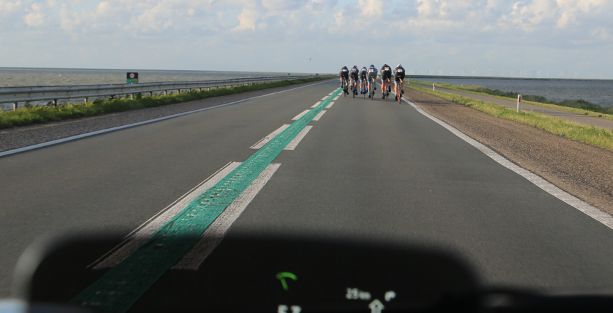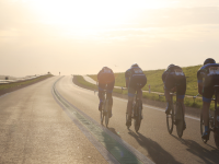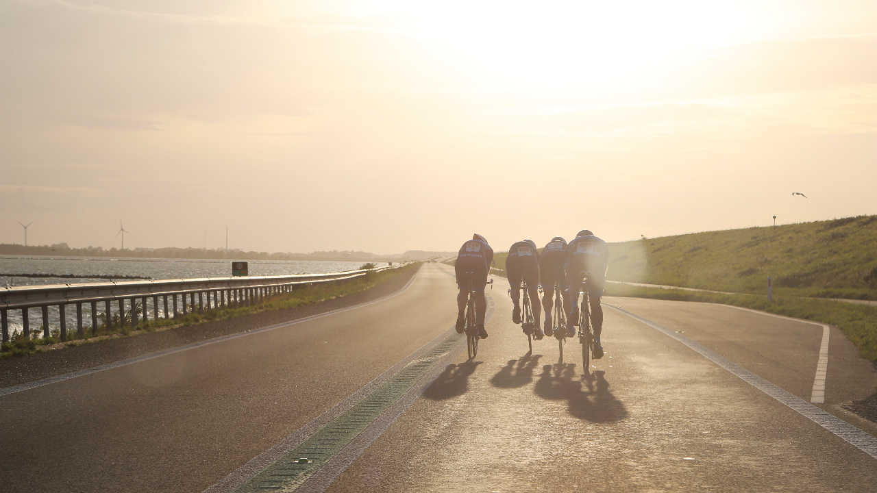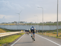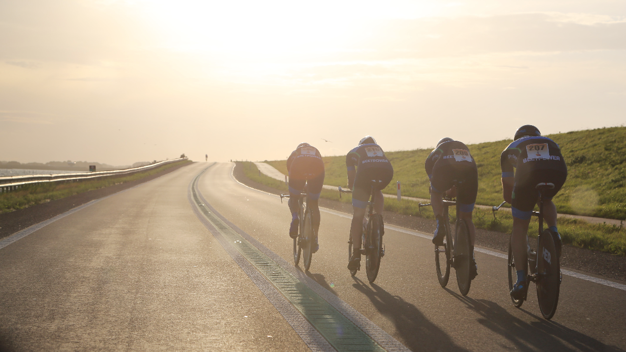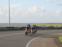 Afgelopen zaterdagavond werd éénmalig de dijk tussen Enkhuizen-Lelystad afgesloten voor autoverkeer om daar een ploegentijdrit te houden voor amateurs en professionele wielrenners.