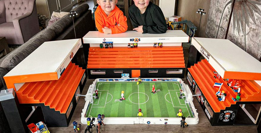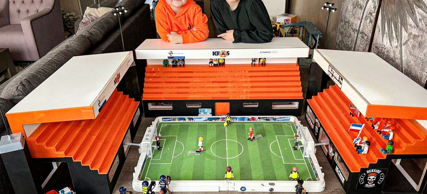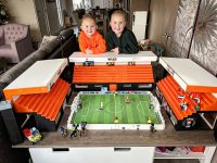 Het resultaat is een stadion in miniatuur waarin niets ontbreekt. Mick benoemt spelers, sponsors, wissels en de VAR. Het hele ritueel, maar dan op kinderhoogte. Mick speelt. Thomas kijkt toe.