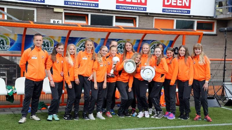 Ook de selectie D1 van FC Volendam werd in de bloemen gezet door Misha Salden na het behalen van het kampioenschap. Door beide teams werd een ereronde over het veld gelopen en de meiden en jongens kregen veel applaus.