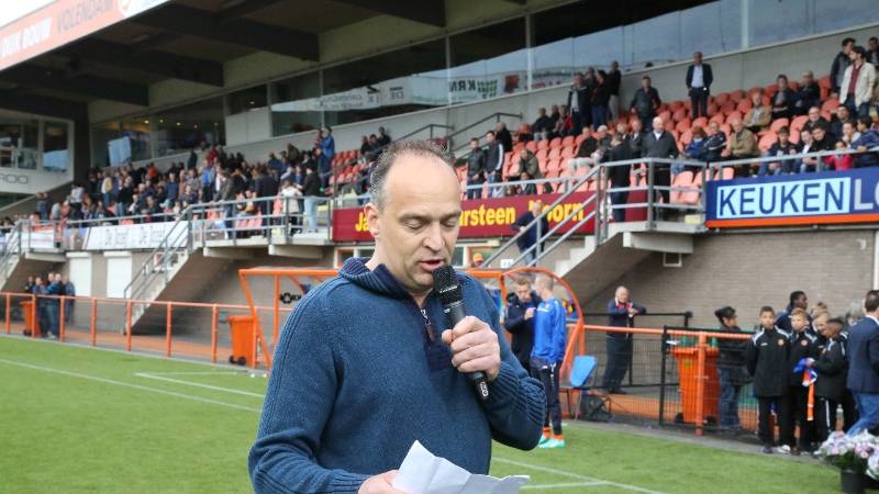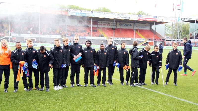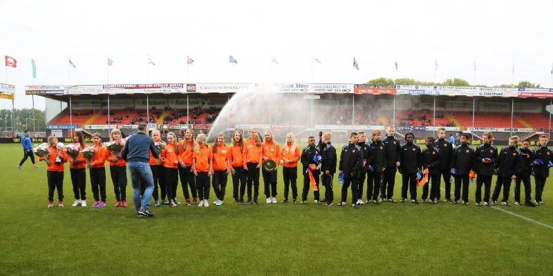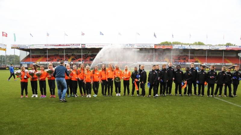 Onder de rust van de voetbalwedstrijd FC Volendam-FC Eindhoven werden twee kampioensteams gehuldigd en in de bloemetjes gezet.
