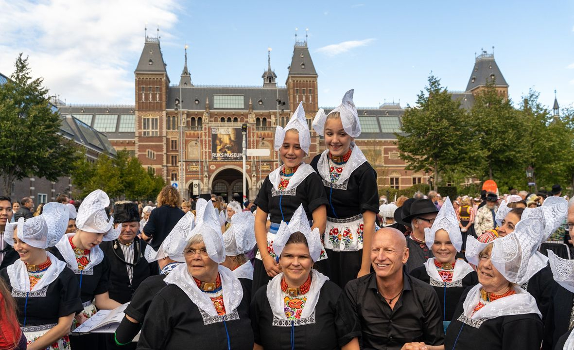 Ruim zeshonderd mensen in klederdracht zijn op het Museumplein in Amsterdam samengekomen om een groepsfoto te laten maken door fotograaf Jimmy Nelson. De bijzondere bijeenkomst werd georganiseerd om de lancering van Nelsons nieuwe boek ‘Between the sea and the sky’, waarin hij traditionele gemeenschappen in Nederland portretteert, te vieren.