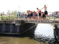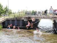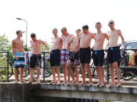 Op het aftellen van 1-2-3 sprongen de heren in het water om zo flinke plonzen of “bommetjes” te veroorzaken in de gracht. Van de waaghalzen konden we zo wat leuke plaatjes schieten.