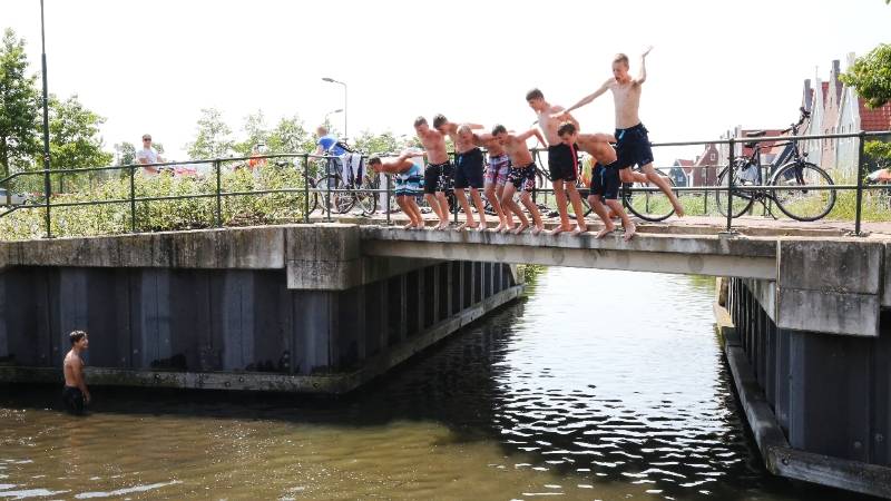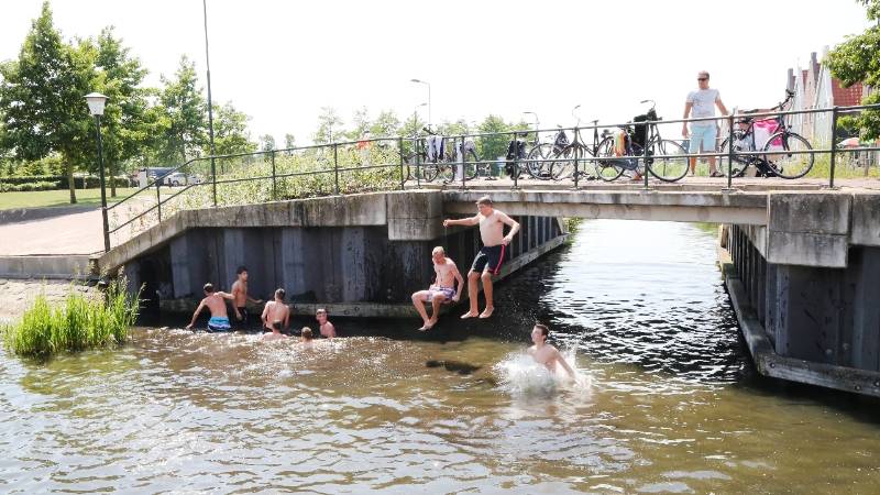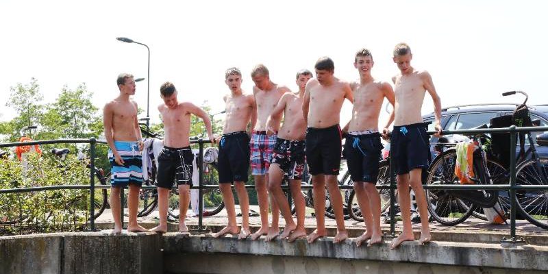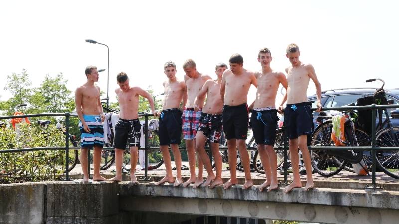 Een groep jongens hield zich op bij de brug. “Hé, mogen wij op de foto?”, werd geroepen, en aldus geschiedde. De mannen wilden graag zwemmend of springend op de foto.