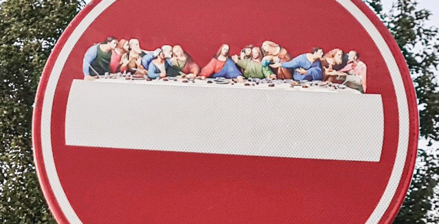 Via het ‘tip-de-redactie’-formulier ontving de redactie een opvallende foto: op een verbodsbord prijkt een miniatuurversie van (Het Laatste Avondmaal). Het tafereel is keurig aangebracht op de witte balk van het bord. De foto is gemaakt aan de Burg. Van Baarstraat, maar ook in de Conijnstraat, Zeestraat en Torenvalkstraat zijn vergelijkbare vondsten gedaan. Eerder doken al ‘kamelenbulten’ op, vuilnisbakken met wiebelogen en Muppets op boomstammen.