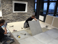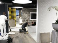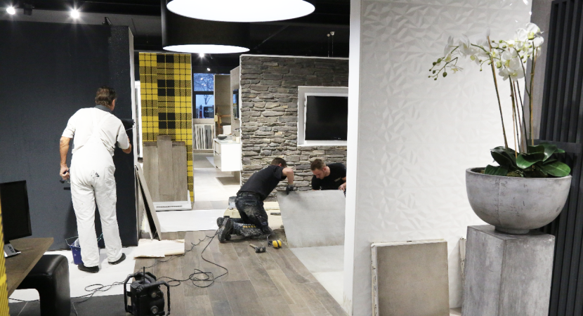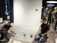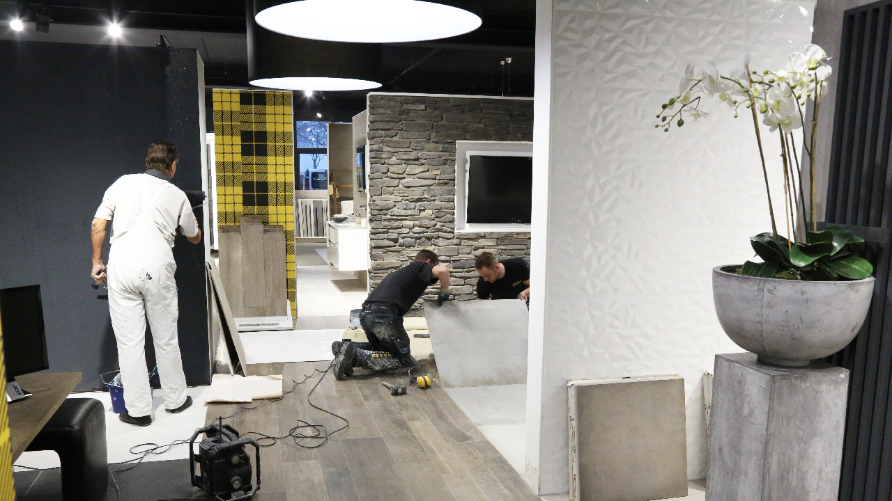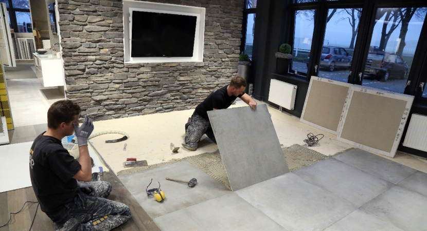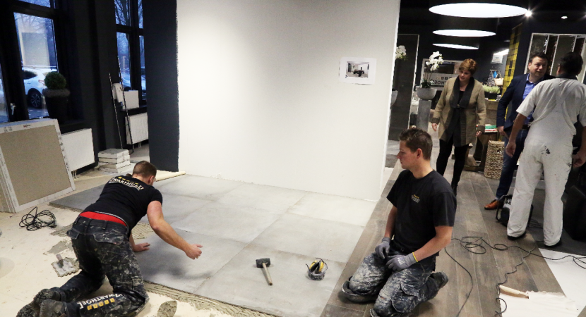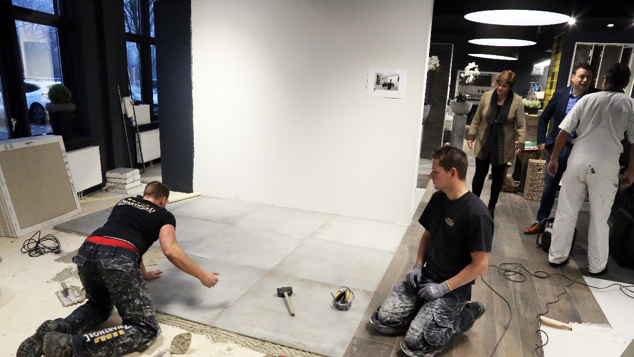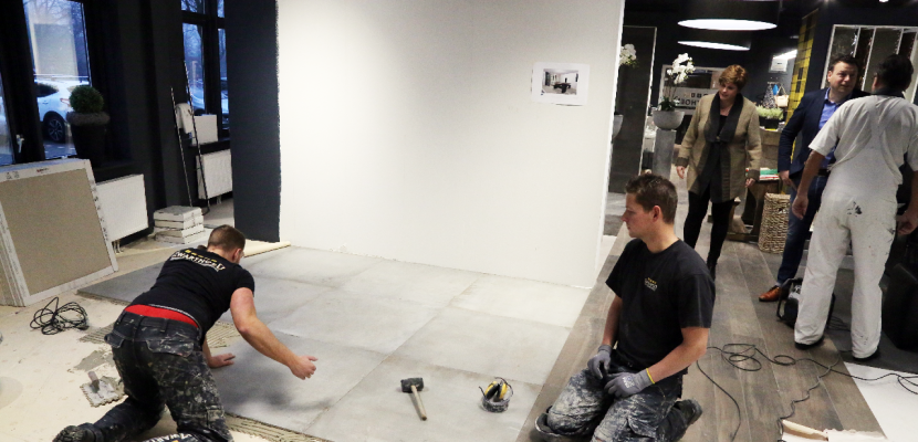 In de showroom van Kirry Zwarthoed aan de Energiestraat te Edam is komende zondag vanaf 11.00 tot 16.00 uur de opening van de vernieuwde showroom. Nieuwe badkameropstellingen zijn in de prachtige showroom geplaatst. Maandag waren de tegelzetters Mike de Wit en Alex Tuijp bezig met ‘t leggen van vloertegels in de showroom.